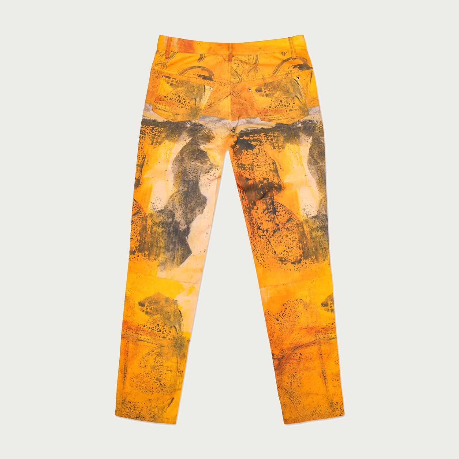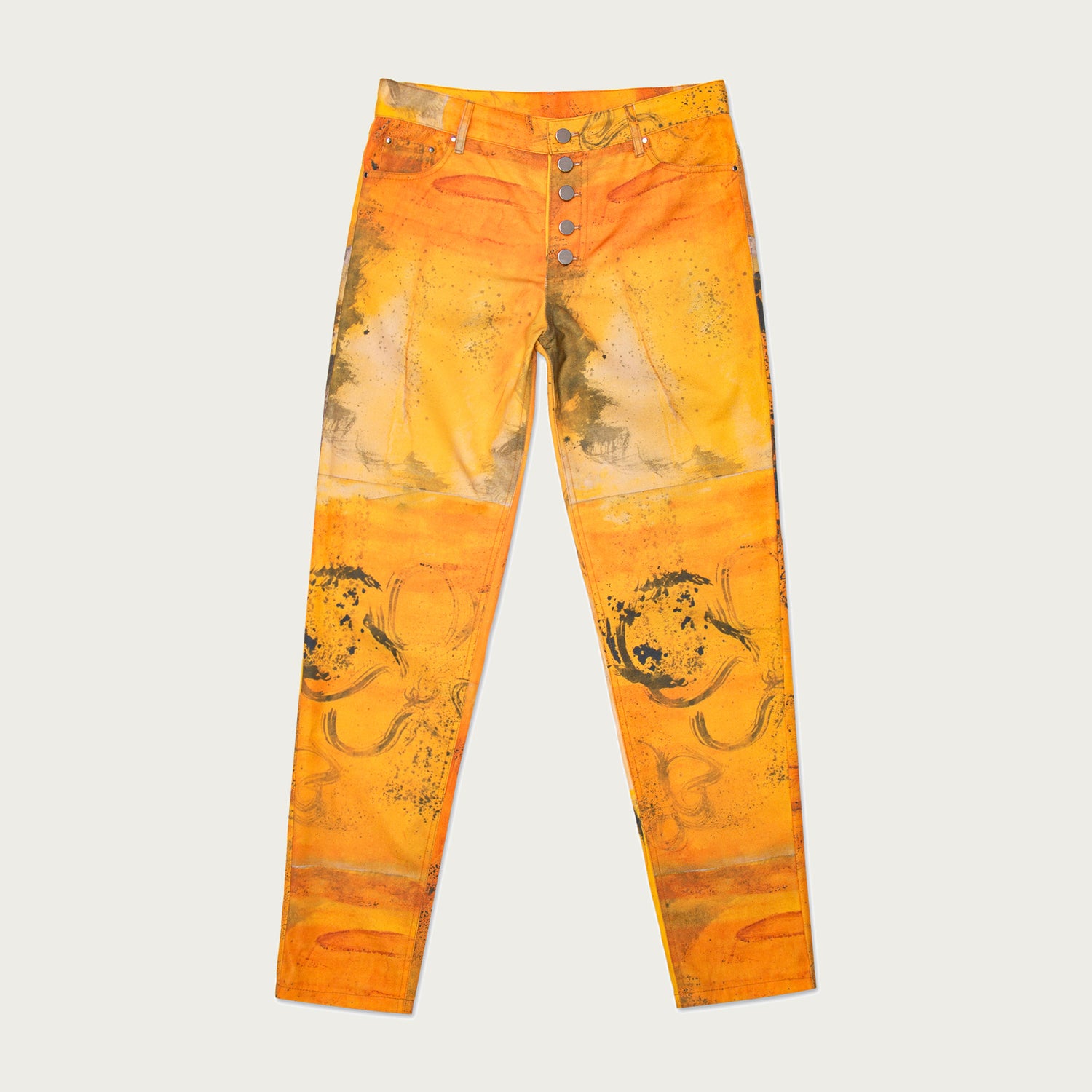 Two way stretch 9 oz pants featuring a 5 button fly front. 5-pocket styling. 100% polyester. Polyester used for the longevity and sustainability of the artwork.