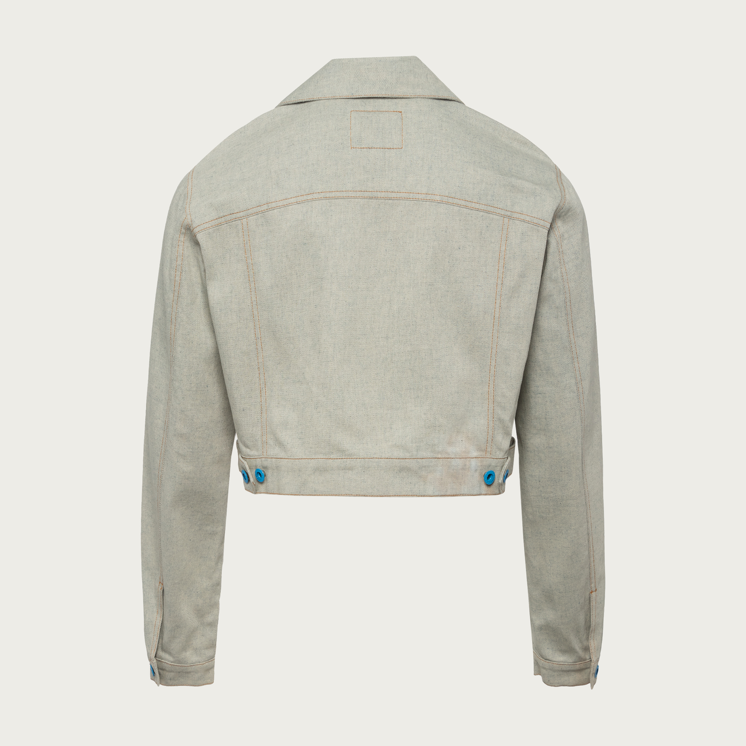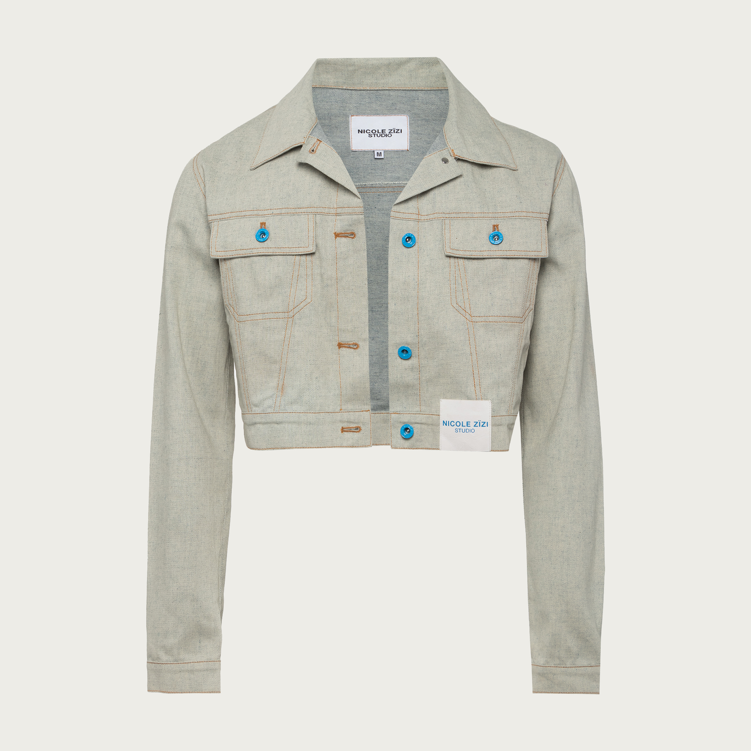 Cropped Recycled Rinse Denim Trucker Jacket featuring garments made with traceable reclaimed Japanese denim from cutting waste. Dyed, weaved, and finished into NICOLE ZÏZI STUDIO jacket.