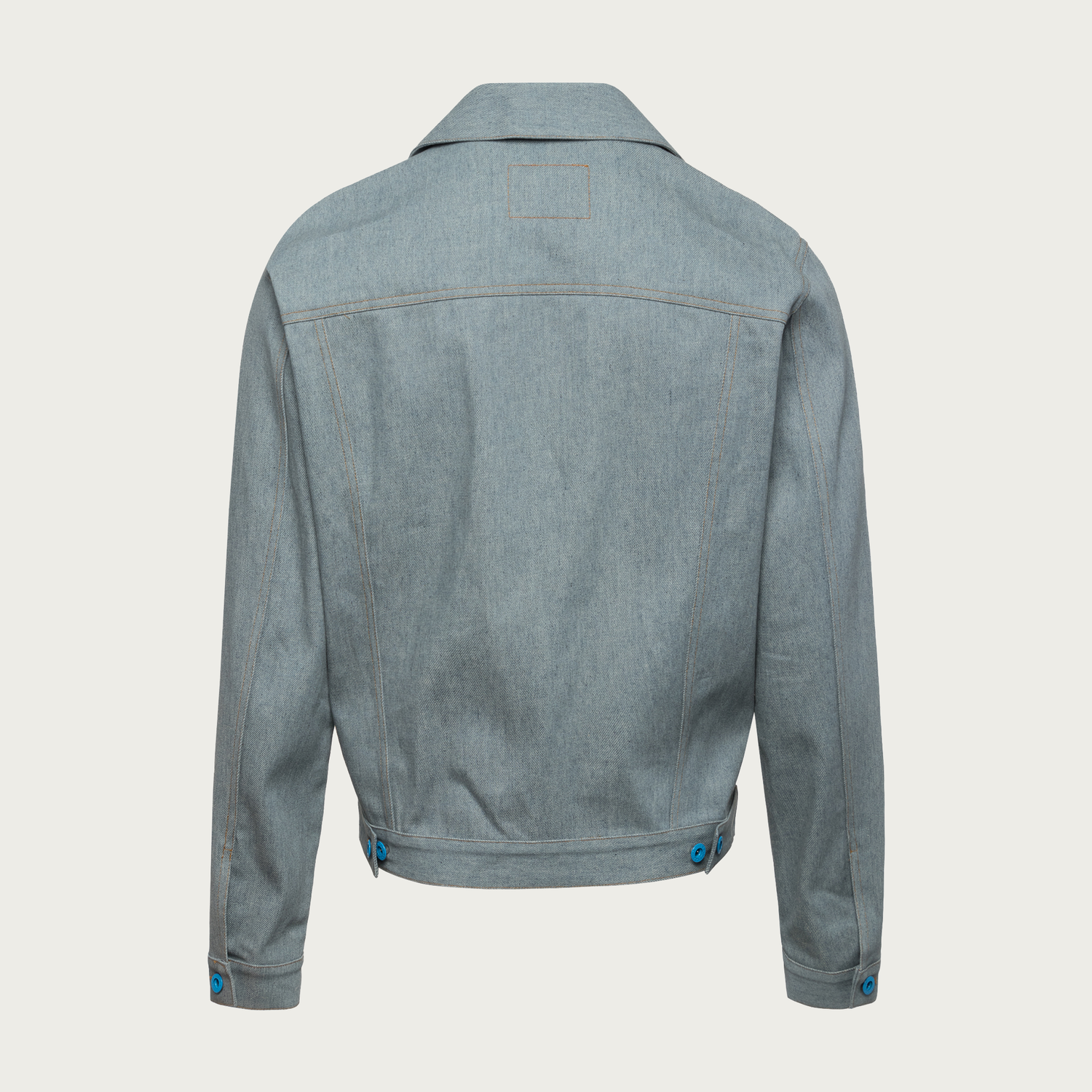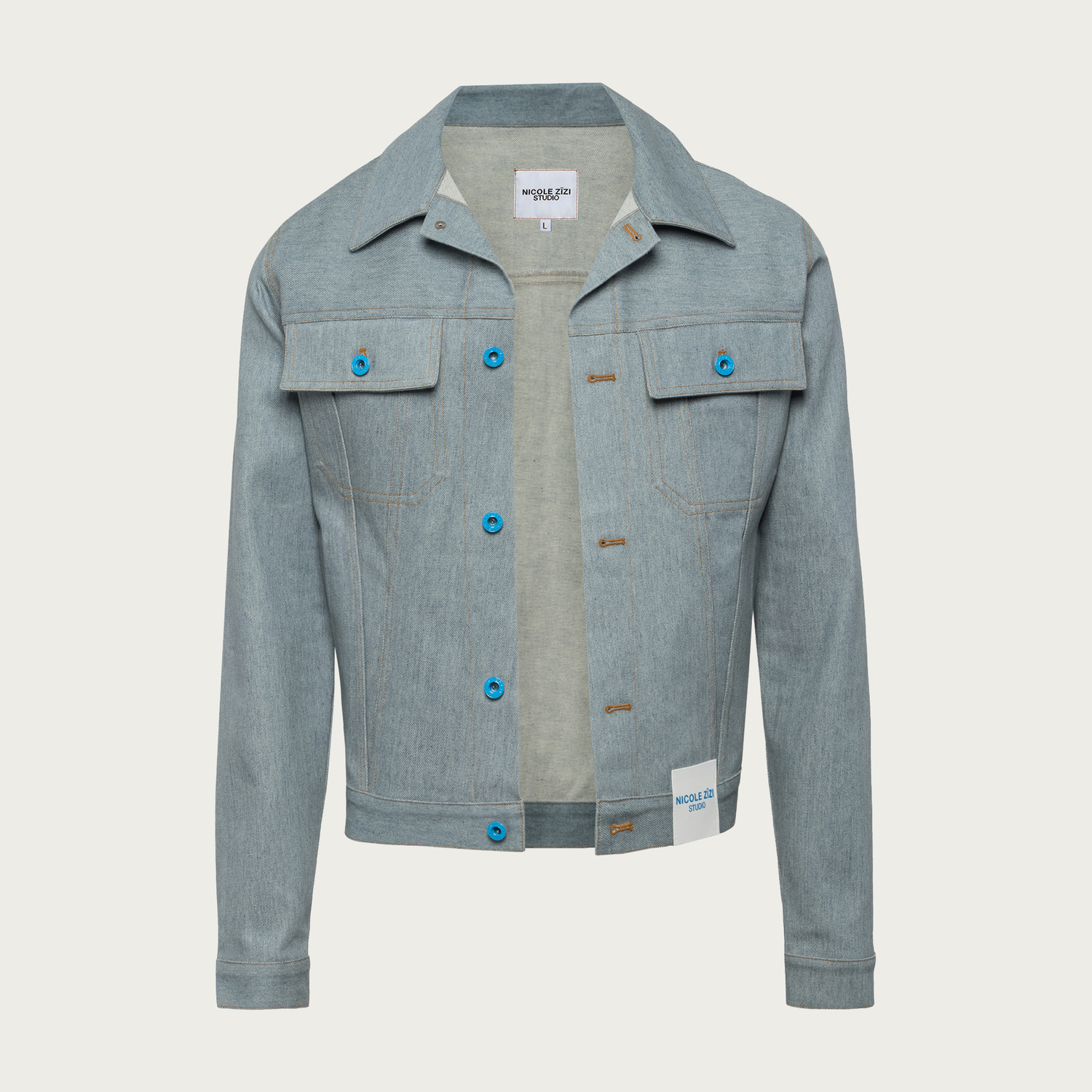 Recycled Blue Cotton Denim Trucker Jacket featuring garments made with traceable reclaimed Japanese denim from cutting waste. Dyed, weaved, and finished into NICOLE ZÏZI STUDIO jacket.