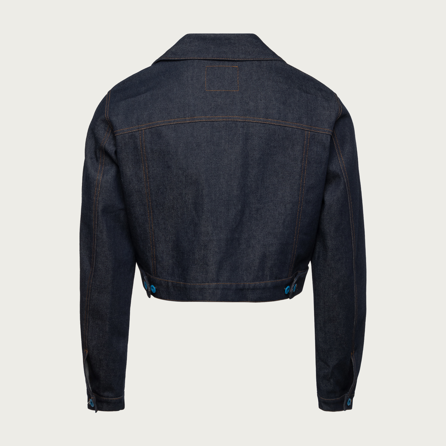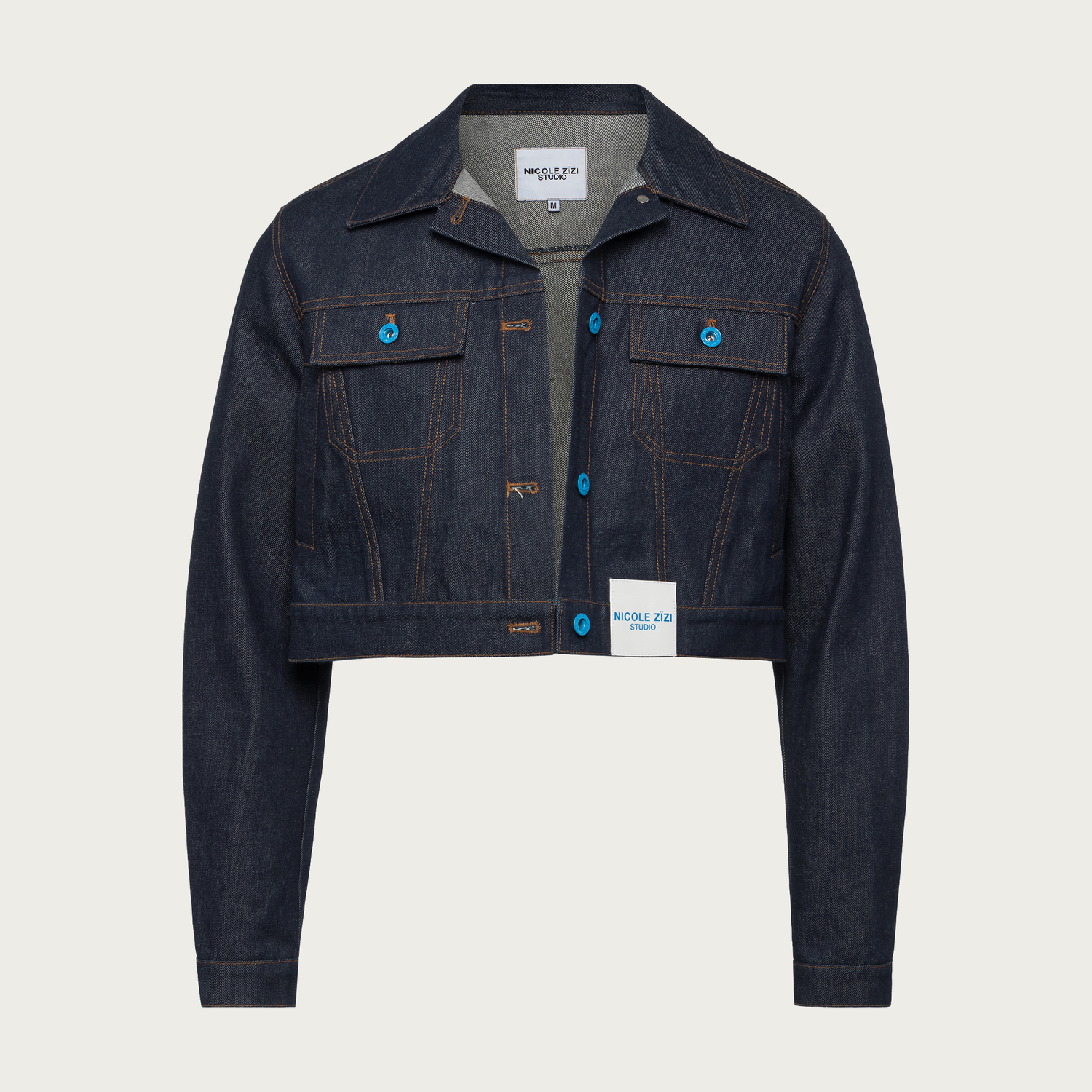 Cropped Recycled Raw Denim Trucker Jacket featuring garments made with traceable reclaimed Japanese denim from cutting waste. Dyed, weaved, and finished into NICOLE ZÏZI STUDIO jacket.